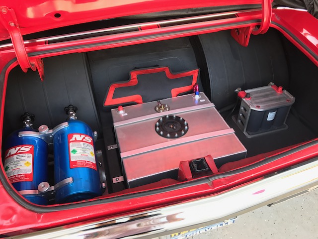 Not knowing if he wanted to restore his ride or build a Pro Street Car, Shawn stuck with his gut and built the Pro Street Car of his dreams. Starting with a Chris Alston back half kit and the 33”x22”x15 Mickey Thompson’s, he and his good friends Brandon Scott went to town cutting. Soon after, Shawn met well-known engine builder, Frank Beck. They became good friends and Beck built him a 565ci Big Block high compression nitrous engine that makes 900 hp on the motor…